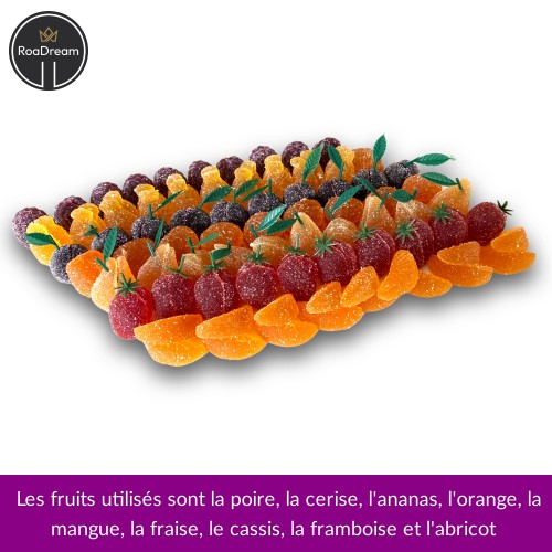 - Les fruits utilisés sont la poire, la cerise, l'ananas, l'orange, la mangue, la fraise, le cassis, la framboise et l'abricot